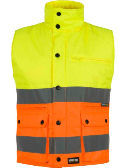 WorkTeam Chaleco acolchado y multibolsillos con dos cintas reflectantes y tejido de alta visibilidad. HOMBRE